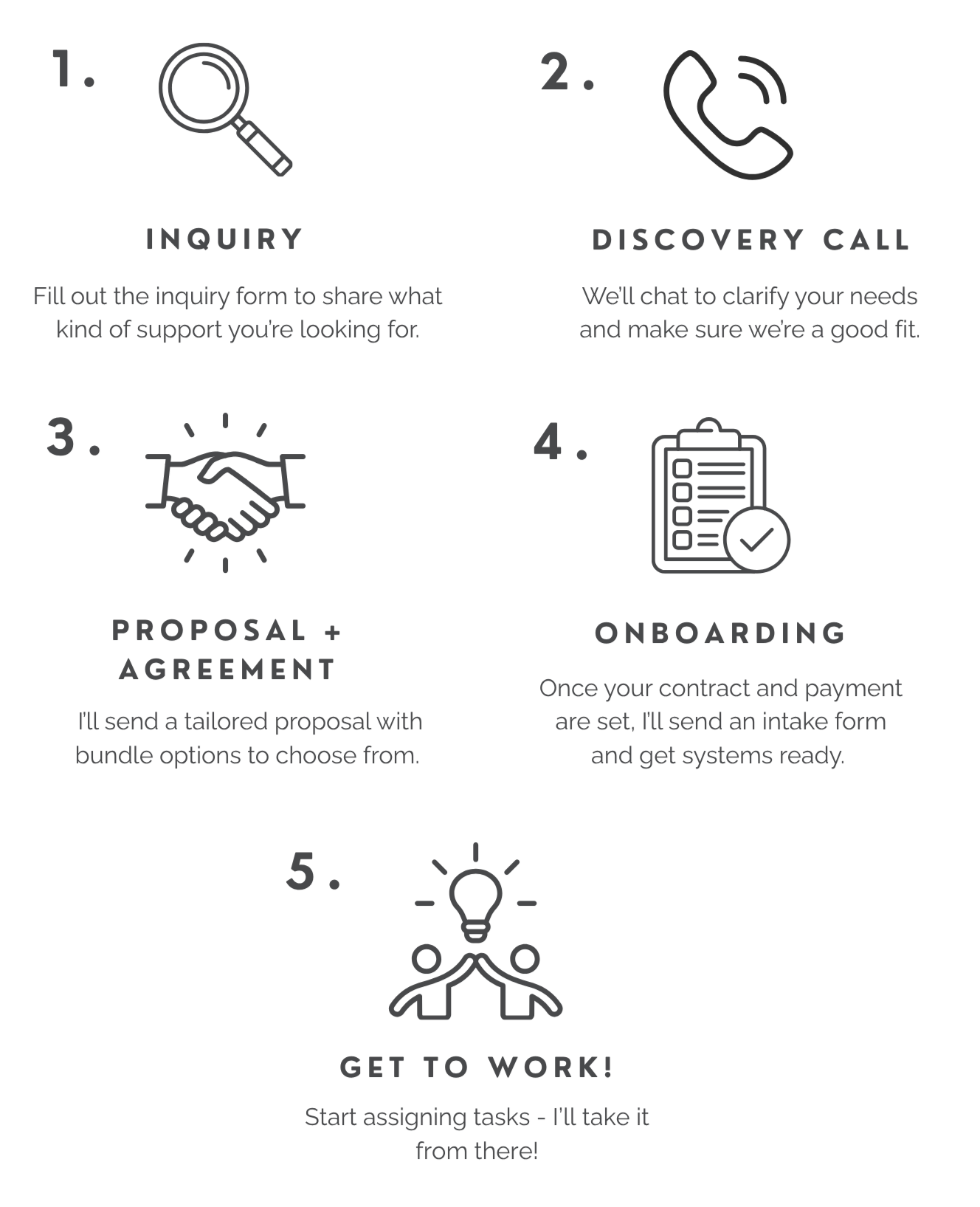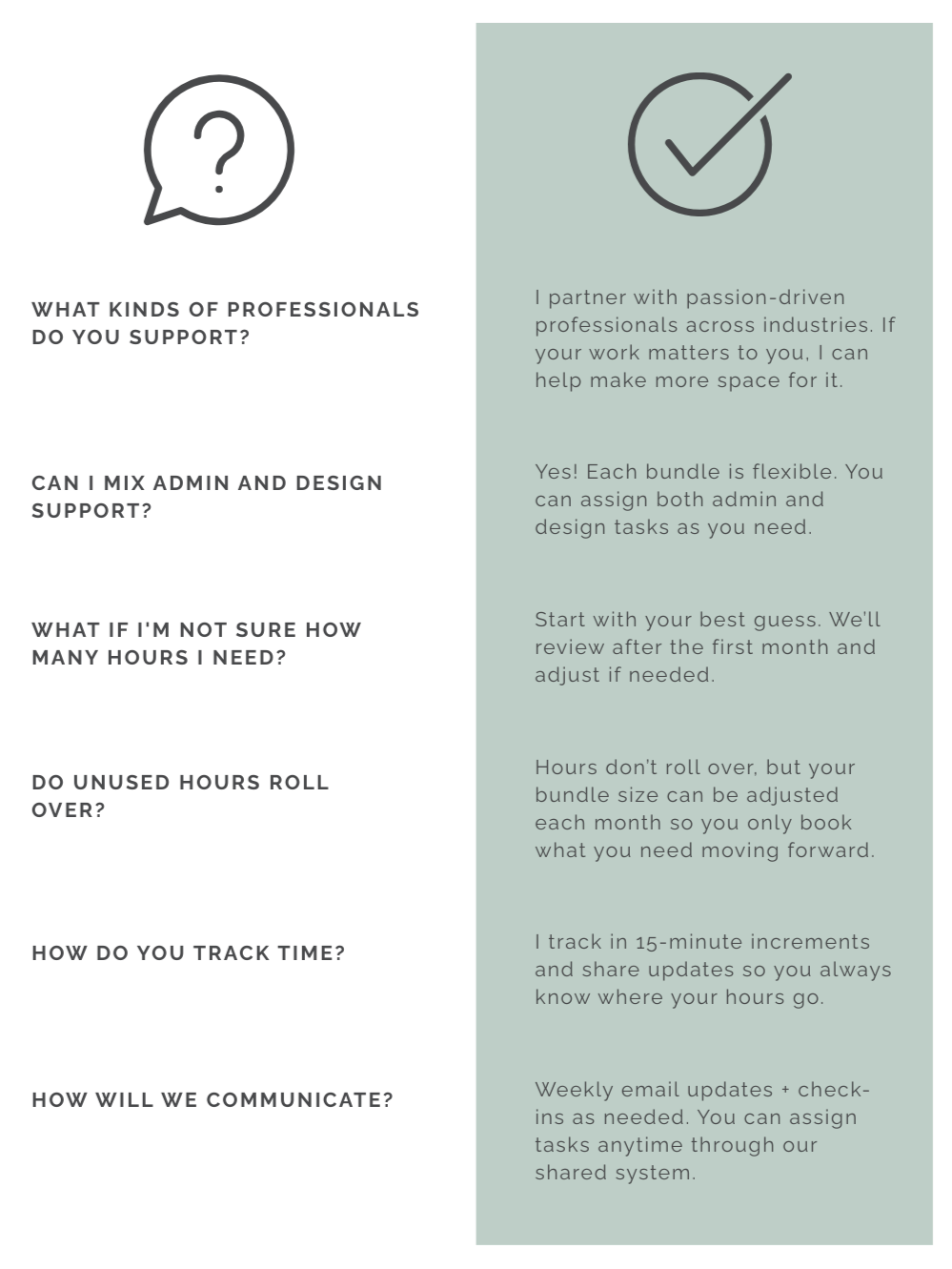 Every partnership looks a little different depending on the kind of support and rhythm you need. I offer monthly bundles designed to meet you where you are — whether you’re easing into support or ready for a full collaborative partnership.Because each client’s mix of admin and design needs is unique, I’ll share bundle recommendations and pricing details after learning more about your work and goals.