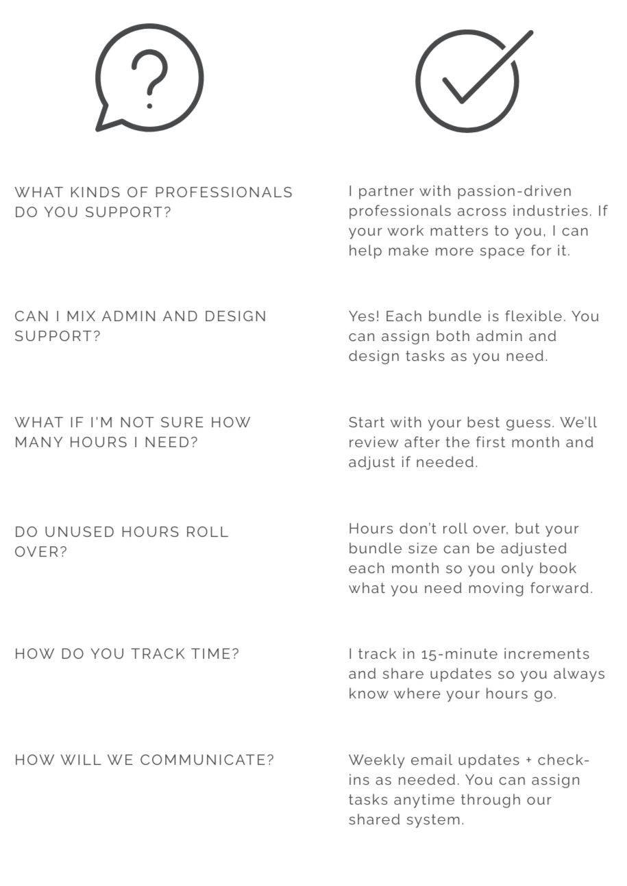 | Perfect for those seeking light support | Great for ongoing admin, design, or both | Ideal for clients who want consistent, in-depth collaboration |