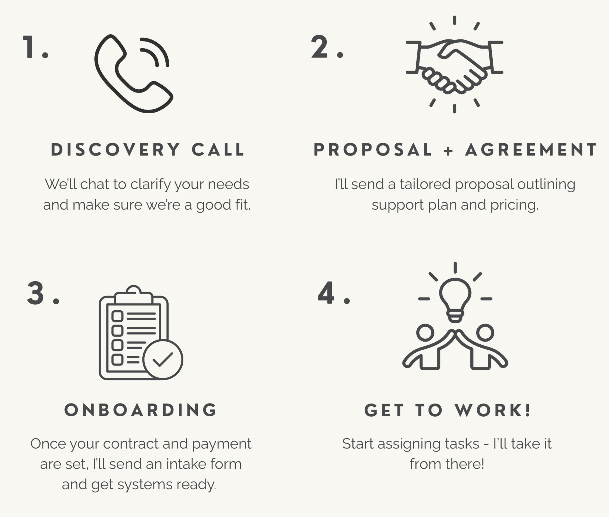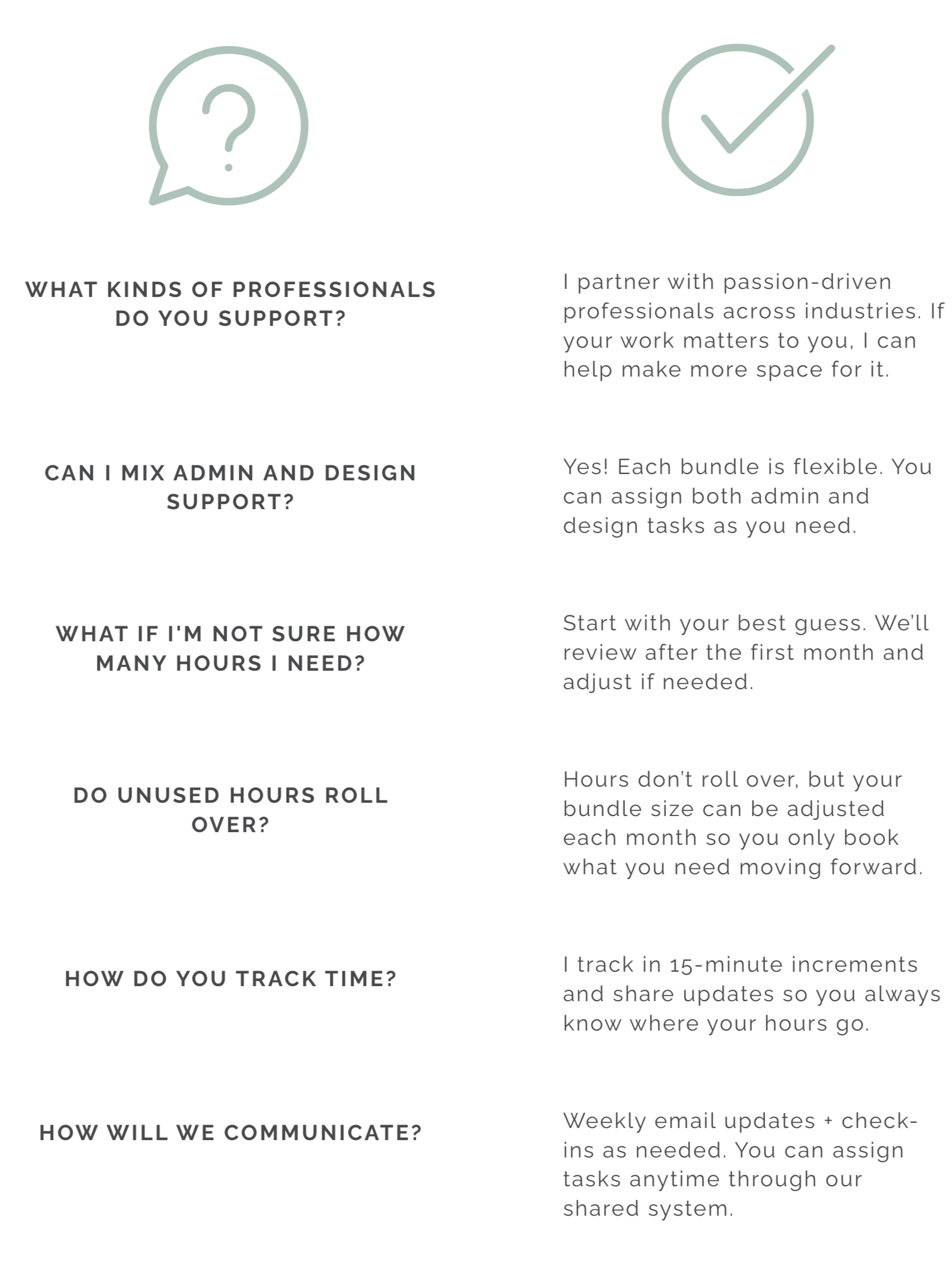 Every partnership looks a little different depending on the kind of support and rhythm you need. I offer monthly bundles designed to meet you where you are — whether you’re easing into support or ready for a full collaborative partnership.Because each client’s mix of admin and design needs is unique, I’ll share bundle recommendations and pricing details after learning more about your work and goals.